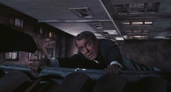 Vertigo is a movie that gets better and better the more one thinks about what he has just seen. Its seemingly two-part plot development and the strange behavior of James Stewart’s character to contribute to both parts (for one, the consistent attacks of vertigo; for the other, the strange obsessions to a look-alike) create an absurd aura to surround every viewing, but when one looks at the film as a whole, it is so completely thought-provoking, the idea so completely awe-striking, no one can ever forget it. It combines all the great aspects of every fantastic Hitchcock picture: an all-star cast, a brilliant Herrmann score, intense angles to contribute to fright, obsessive love stories, and plot twists—including the hint forward at the plot twist that is subliminally hidden in the screenshots that precede it. The plot, when considered in its completion, is mind-blowing. A man suffering from a mental/physical disorder accepts his final investigation job—at first dealing with the “supernatural”—and then moves to his own absurd obsession with the object of his investigation. The entire movie is a masterwork of terror, mixed with mystery, mixed with romance, mixed with excitement. The levels of variety quill-work are so interlaced so as to cancel out any leniency toward any specific expectation or niche of comfort within a particular genre. This movie was brilliantly directed and brilliantly acted, and the score was brilliantly conceived. Bernard Herrmann’s famous love theme for the film is as translucent as it is polyphonic, its cliché crescendos beautiful when standing alone, but strikingly symbolic when accompanied by the feigned love Stewart’s character has created for the idea of a perfect woman. The strange irony of the film is that this love is forced upon him by a real, actual woman, yet, one that cannot escape the boundaries of her own desired conformity, because she is not real. Further irony lies in her reciprocation of the love, but in the end, neither the fake nor the real woman can have the man, and he remains a victim of his own delusions. The movie is magnificent, on all levels.
