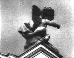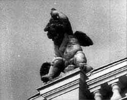 Even the most casual observer can see that the lion is “rising up,” a symbol of the revolution. Just as a side note, this can be seen as a quick (and most probably unintentional) “shout-out,” as it were, to Lev Kuleshov, for “Lev” in Russian means “lion.” Some may be thinking that maybe the image of the lion was just thrown in, and that maybe, just maybe, I’m reading to deep into all this. If that’s the case, check out the other inanimate object that is incorporated into the montage, an angel: